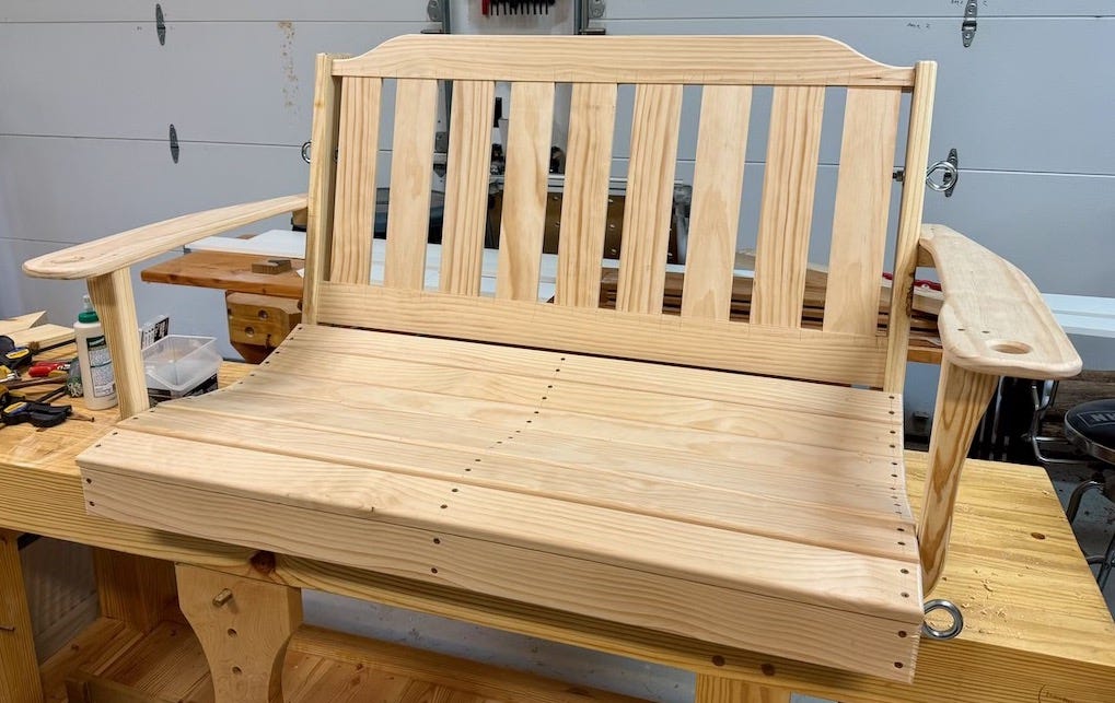 For these, I again turned to my Adirondack templates. Using them, I drew out the shape of each arm rest from a 2x6. I also cut support pieces. After sanding and rounding over the sharp edges, I test fit everything. I also decided to copy a design feature I’d seen on various swings, which was to drill a 1-½-inch hole through the arm rest for the support rope/chain to thread through. I rounded over the edges of that hole and then glued and screwed everything into place. Then I added the final elements: eye bolts that the support rope/chain would attach to.