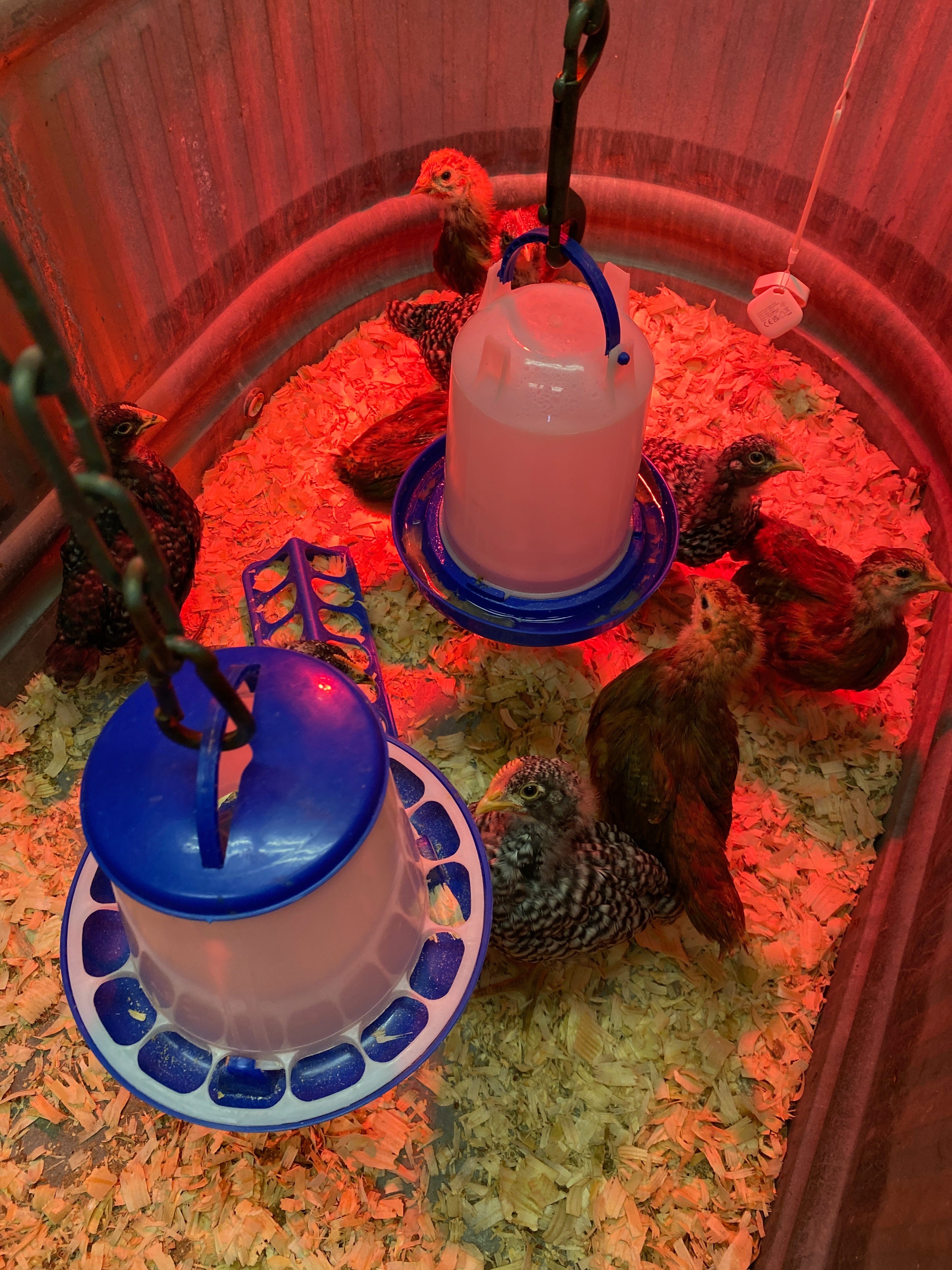 We set the little babies — a selection of Barred Rocks and Rhode Island Reds — up in a nice livestock tub lined with pine shavings and warmed by a pair of heat lamps. Cyn added a Bluetooth temperature gauge so she could monitor their conditions and make sure they were being kept at an appropriate temperature. (For the first week they are to be kept at 95 degrees. Each week thereafter the temperature can drop five degrees.)