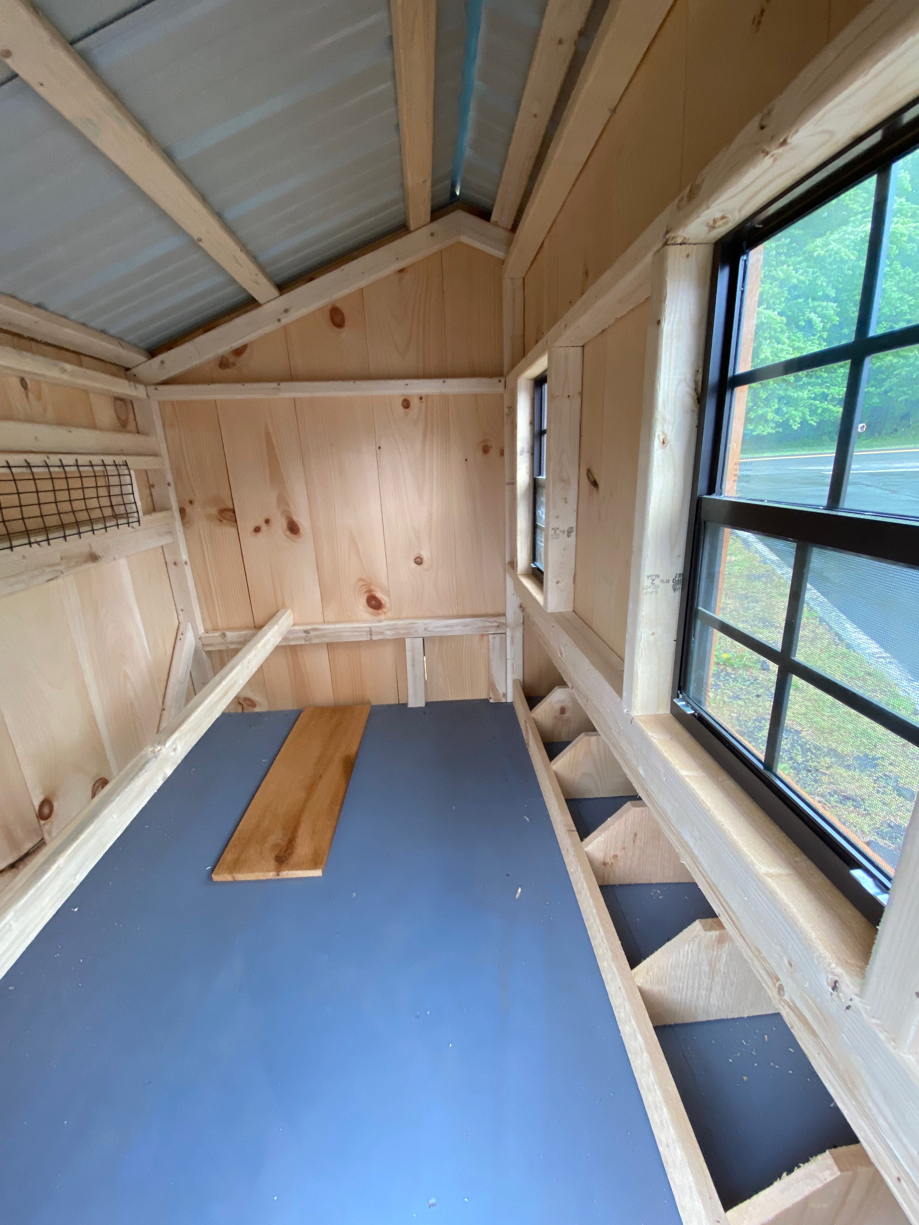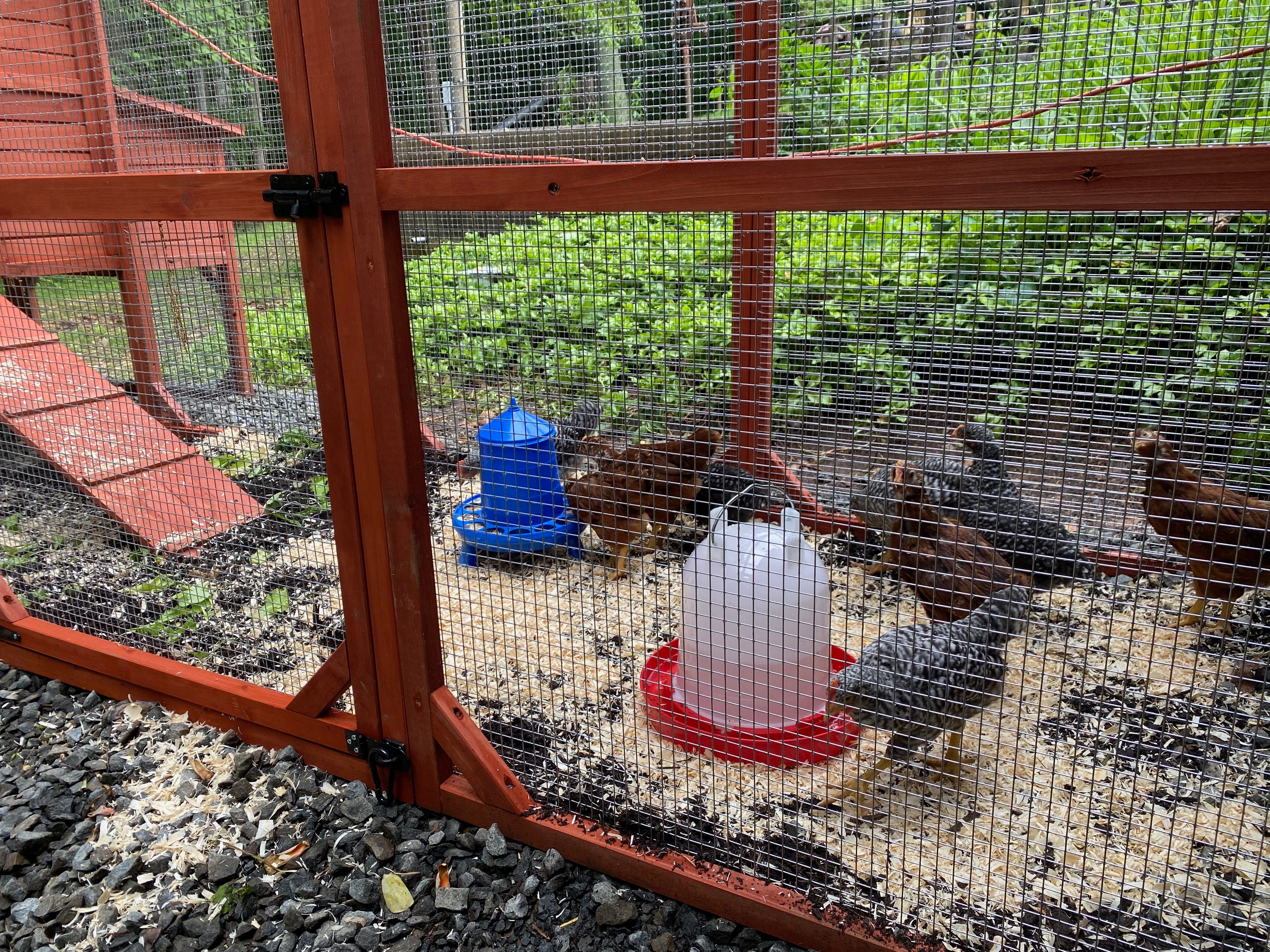 At this point, the coop was in move-in condition. We took the older chicks and let them into their new home. They took to it immediately, running up and down the run, ducking inside the coop, and jumping onto the perches.