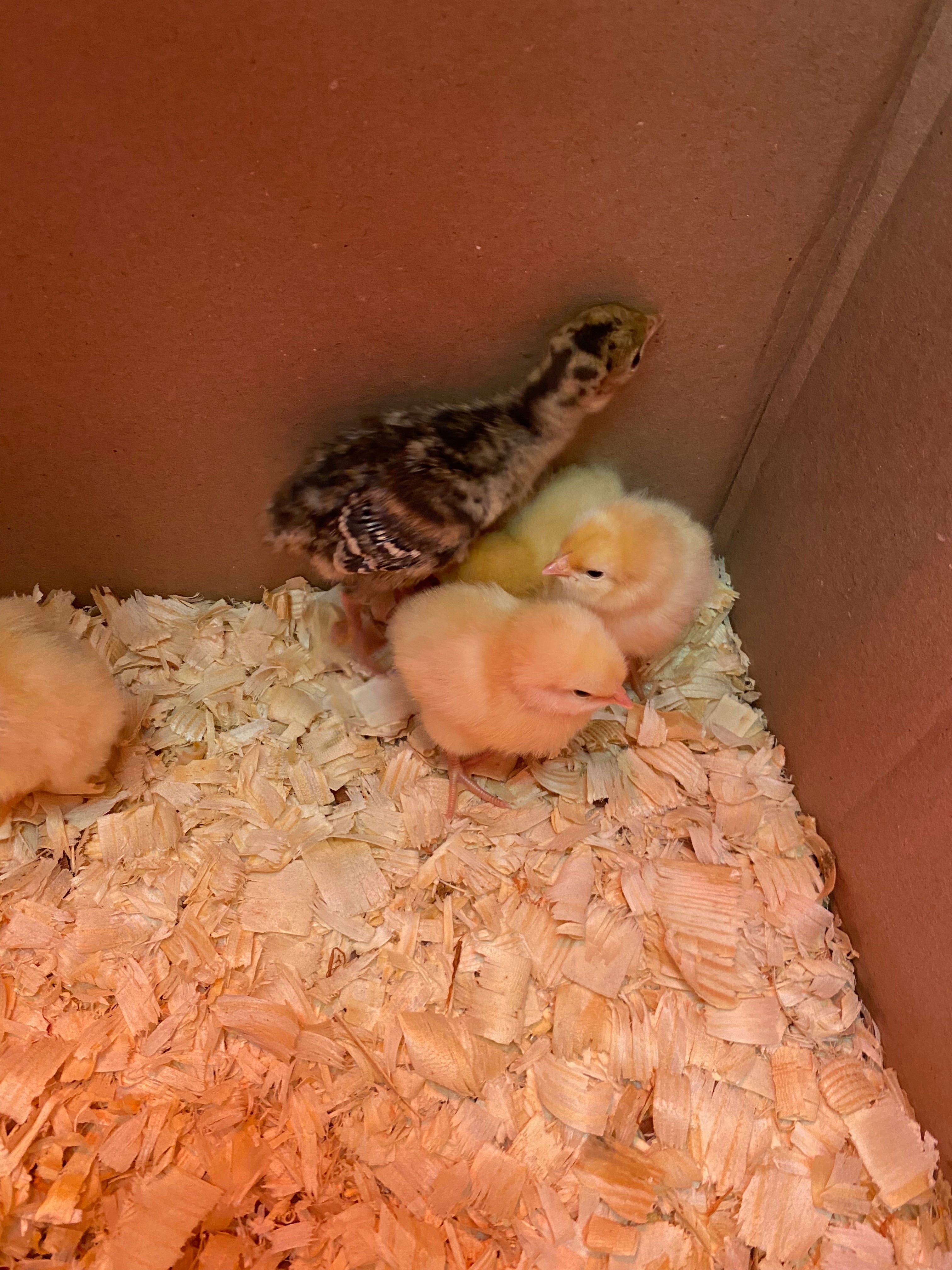 There was only one thing to do: buy more baby chicks so the quail would have some siblings to grow up with. I got four buff Orpingtons and set them and the quail in their own warm and lined container.
