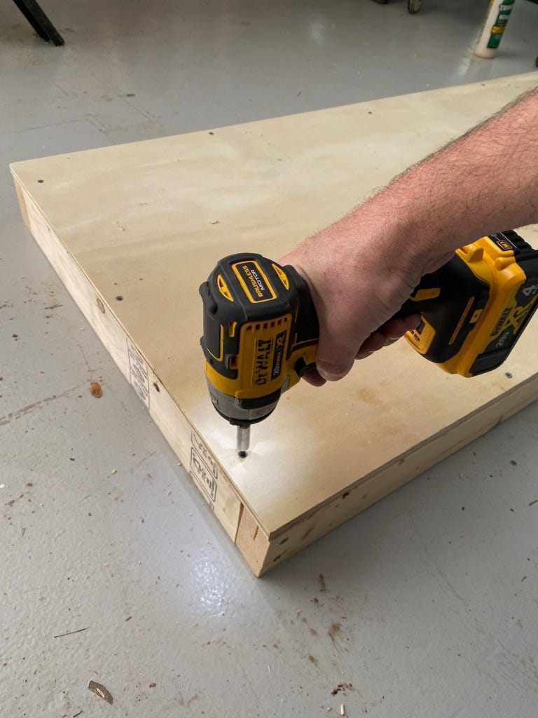 Back in the shop, I cut the 2x4s to length and then glued and screwed them to the plywood. Not only did I make a frame under the edge of the board, but I put a piece across the center as well, just for some extra support.