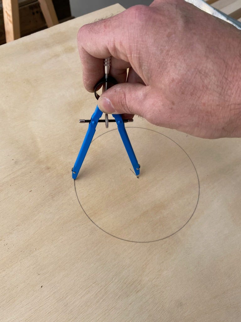 The only carpentry left at this point was to cut the six-inch hole in the top. The specifications stipulate that the center of the hole should be nine inches from the top and 12 inches from either side. I marked this point and then set my compass to three inches in order to draw the six-inch circle.