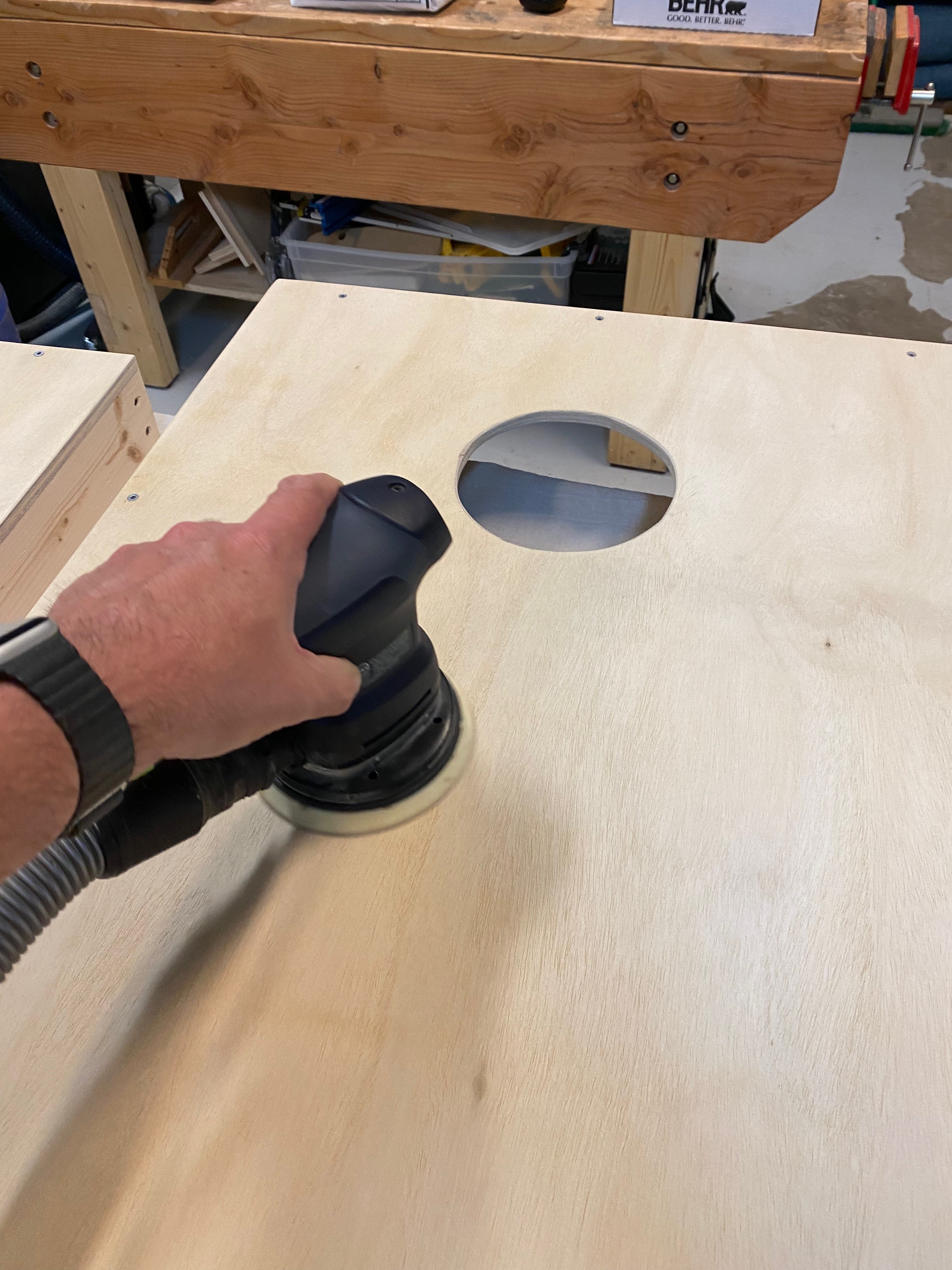 The best way to cut the circle, then, would have been to use a jig and a plunge router. That would have made a perfect circle. So that's not what I did. Instead, I just drilled a hole near the circle's perimeter and then used a jigsaw to cut the hole. The result was not perfect, but it was good enough.
