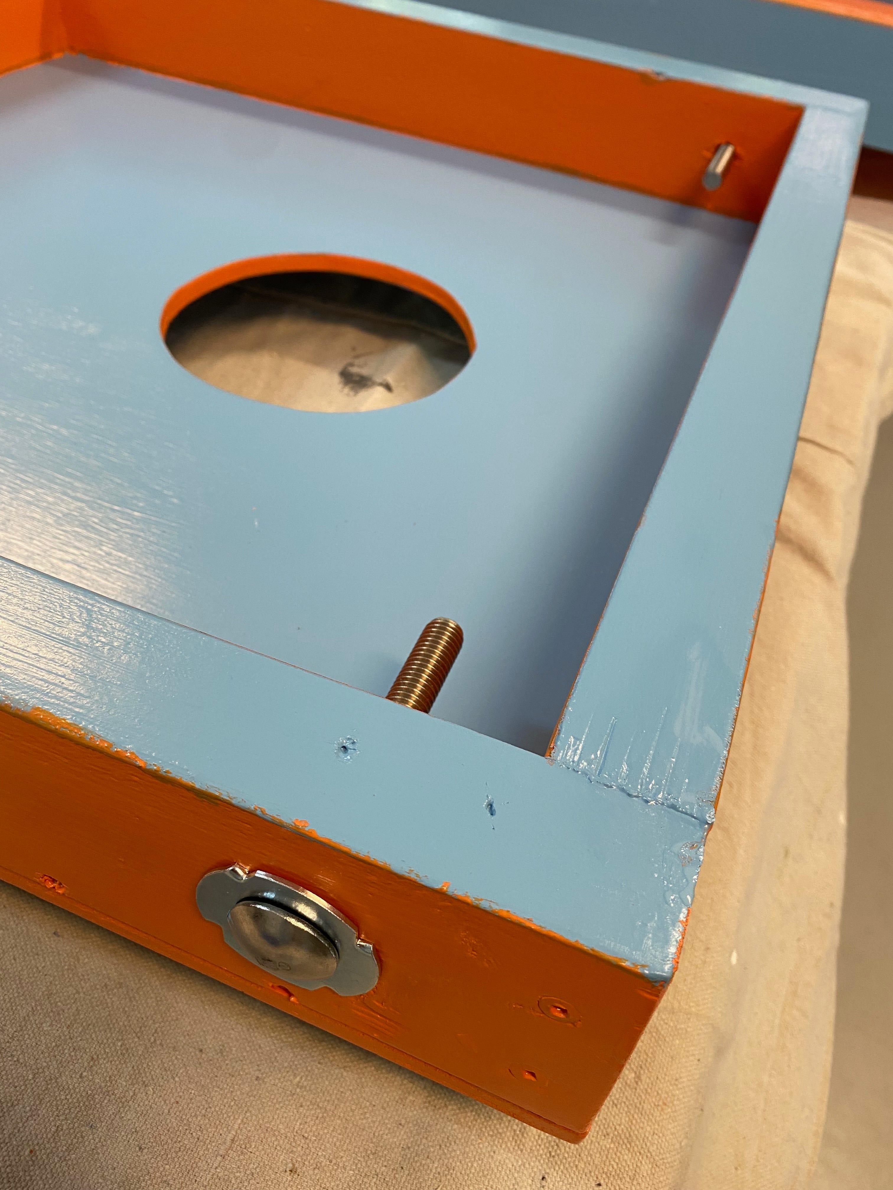 At this point, construction, such as it was, was complete. All that was left was sanding, smoothing the corners, filling some screw holes and painting the thing.