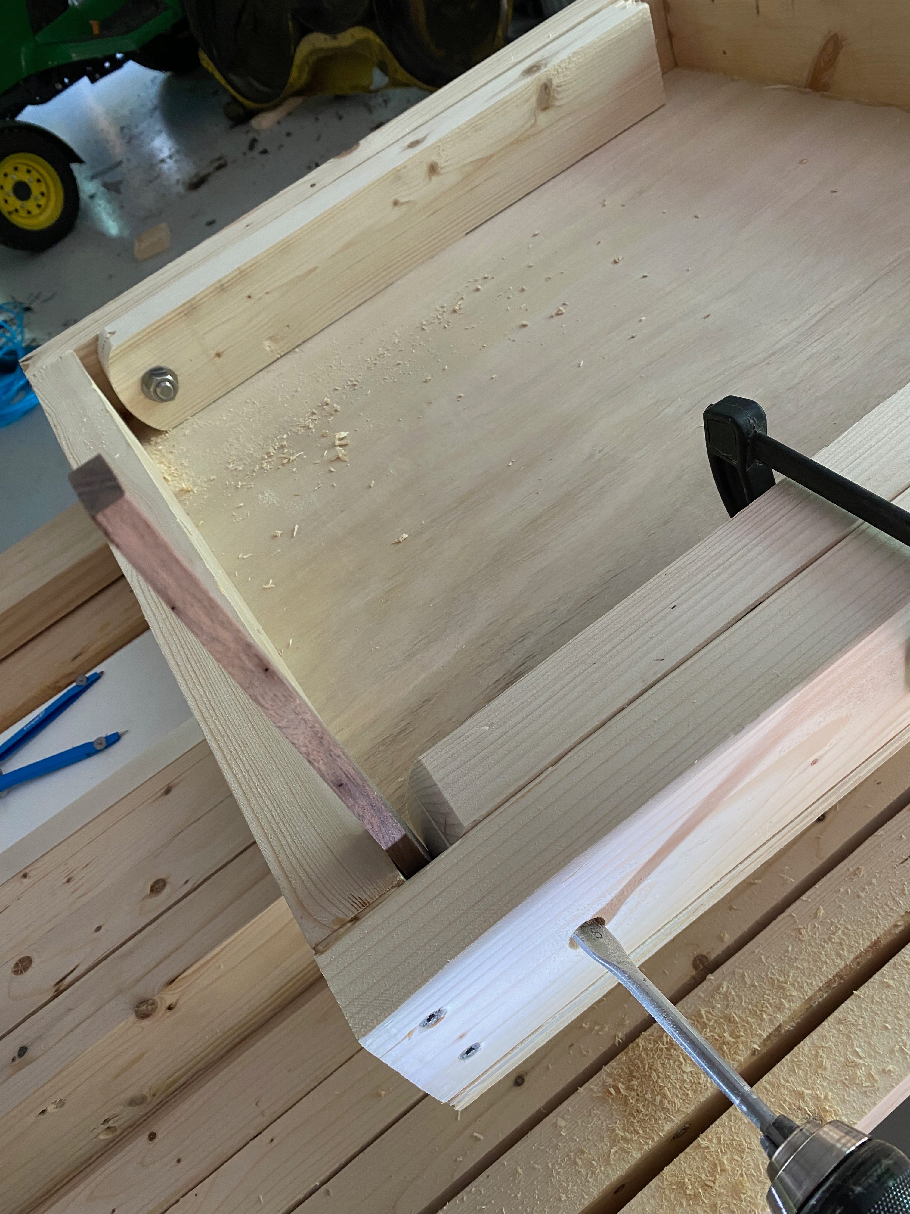 To connect the legs to the boards, I clamped them against the inside rails and drilled a hole through the sides and legs. I used a small stick to set the legs back from the board's edge. To attach the legs, I used a carriage bolt inserted through an anti-turn washer. I also put a normal washer between the side and leg to prevent sticking, and then secured the bolt on the inside with a washer and nut. Then I glued and screwed a cross piece between the two legs in order to keep them aligned.