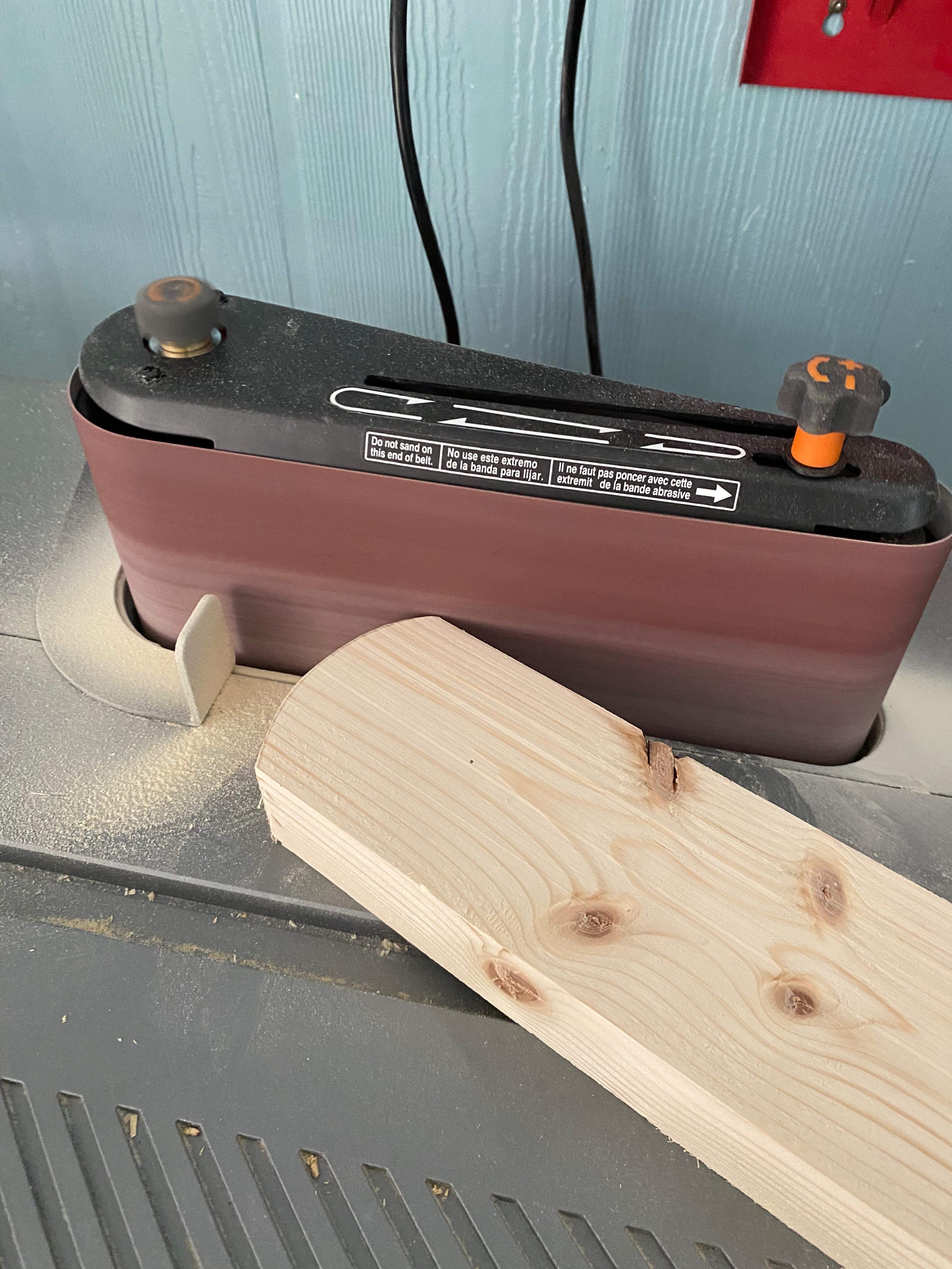 I cut the legs to fit and then used a compass to scribe a curve on one end. A quick trip to the bandsaw where I cut the curves and then to the sander to smooth them out. The other end I cut at an angle so they'd sit flat on the ground.
