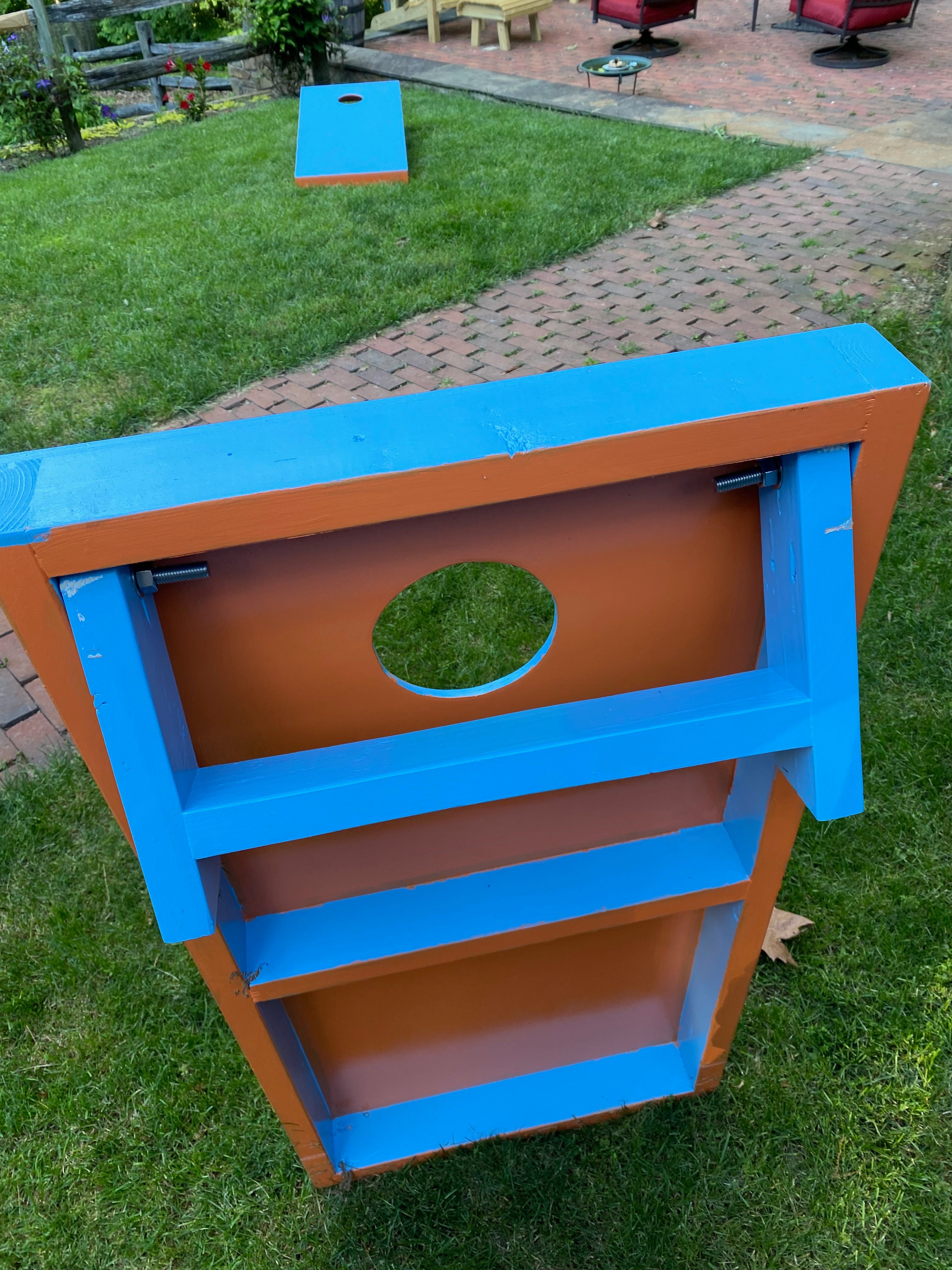 Of course, there's a little more to a Cornhole board than what's above. One also needs legs for the back of board to stand on, and a 9-inch hole cut in just the right spot. And corn-filled beanbags, too.