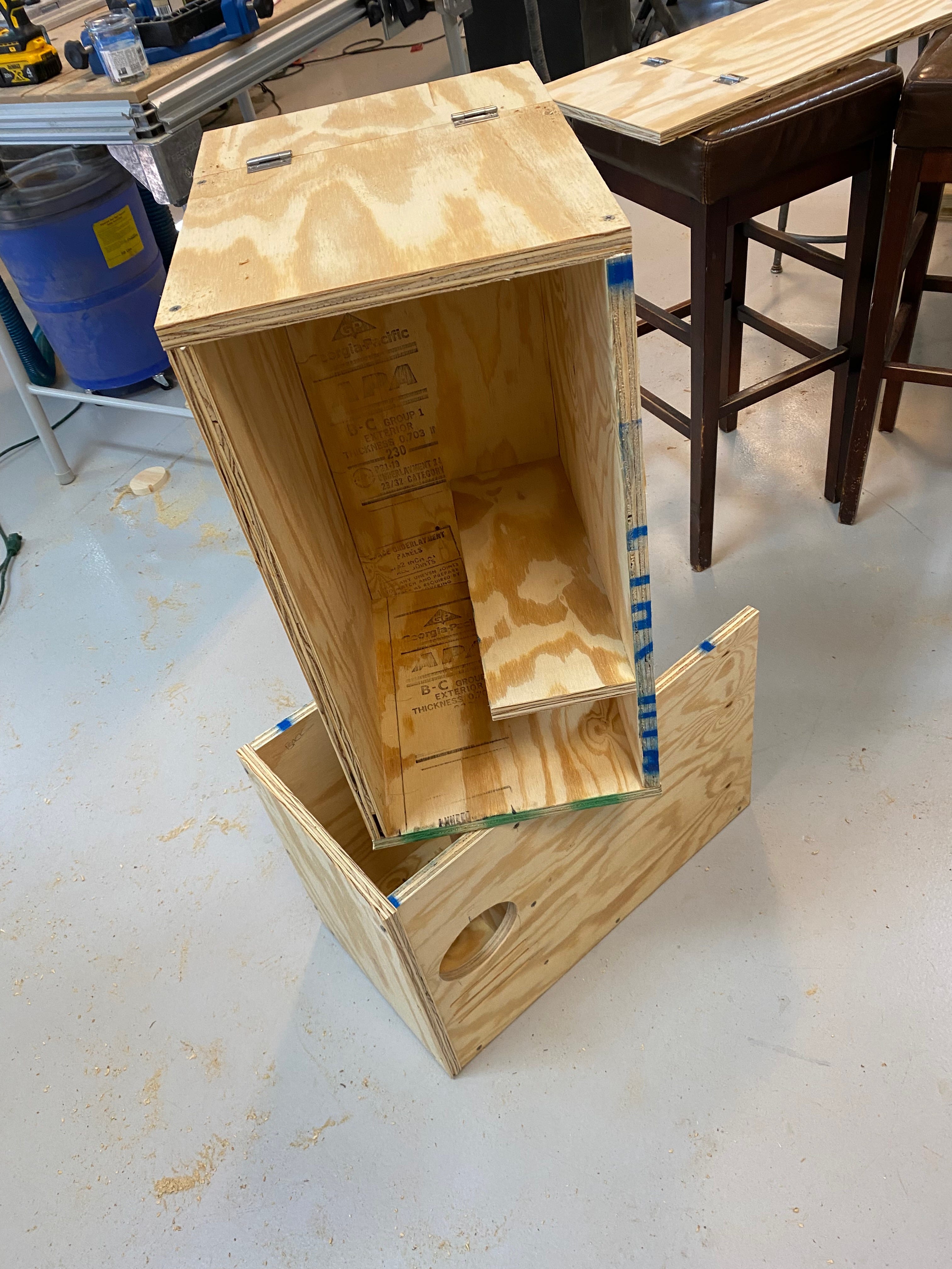 The rest of the construction was straightforward, if more involved than the other birdhouses. The barn owl boxes include an internal divider — apparently barn owls do not accept studio/efficiency apartments and demand one-bedroom units instead. Thanks to some corner clamps and my wife's assistance, we made quick work of them and were ready to put them in the trees.