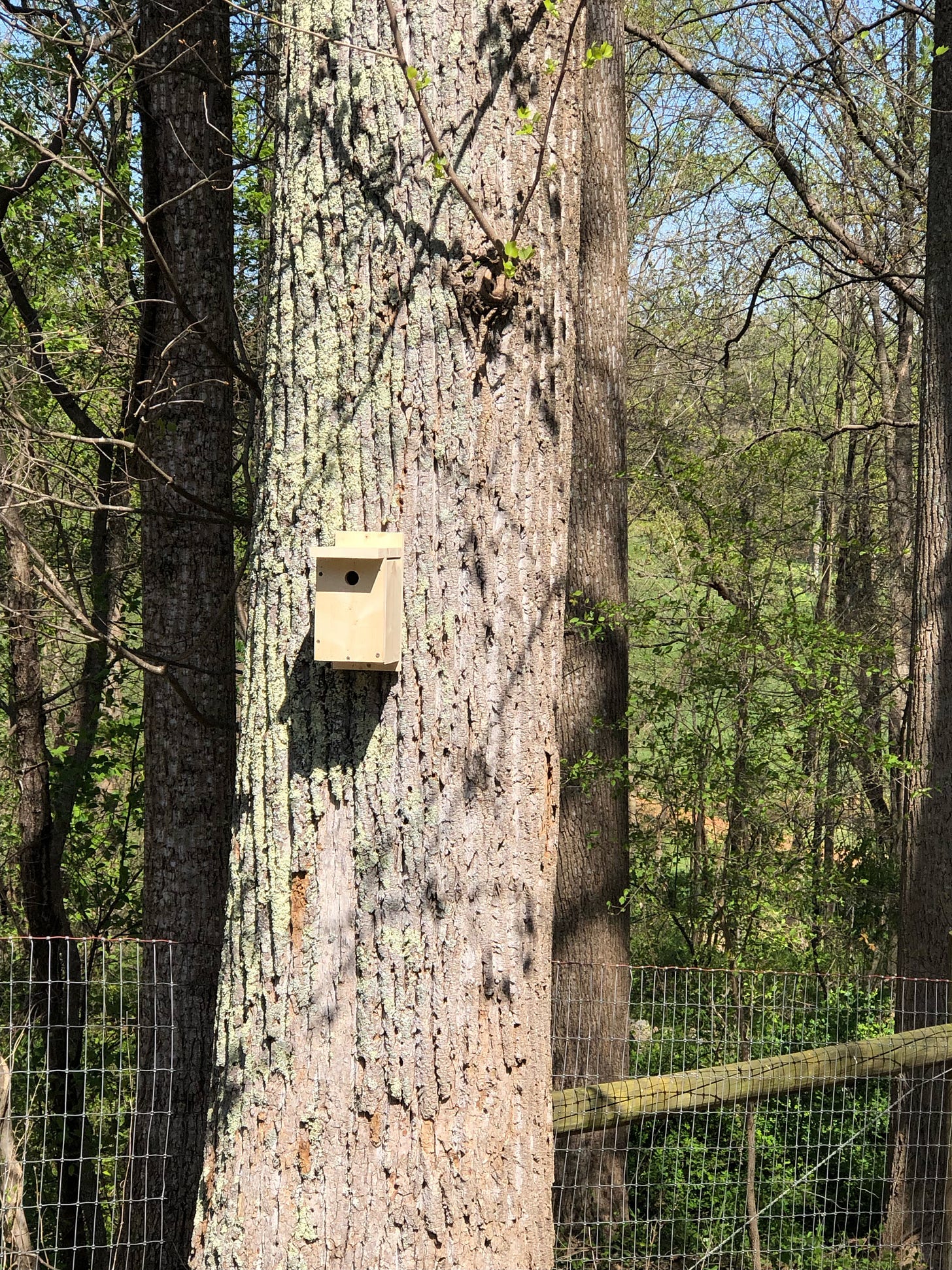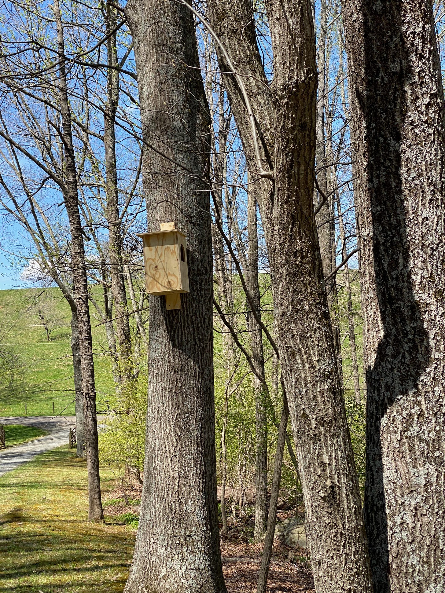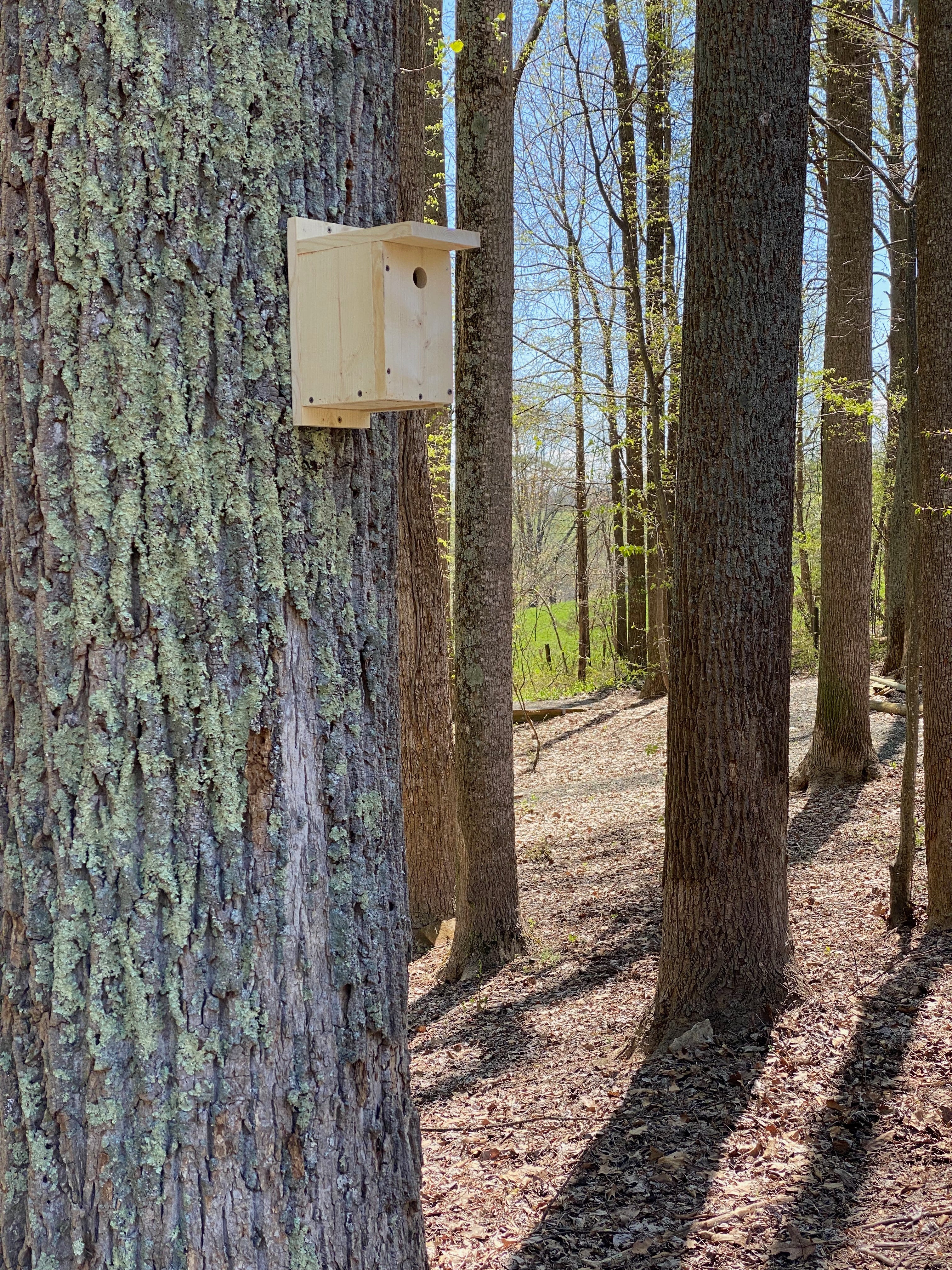The rest of the boxes I needed to mount at least 12 feet high on various trees around the property. These boxes were big and heavy — the pileated woodpecker box is itself about three feet long and 40 pounds. I grabbed a ladder, leaned it up against a tree and clambered up. Holding the box in one hand and the ladder in the other, I used my nonexistent third hand to grab my cordless driver. M also nonexistent fourth hand helped hold things in place while I stored screws in my mouth and levitated in place.