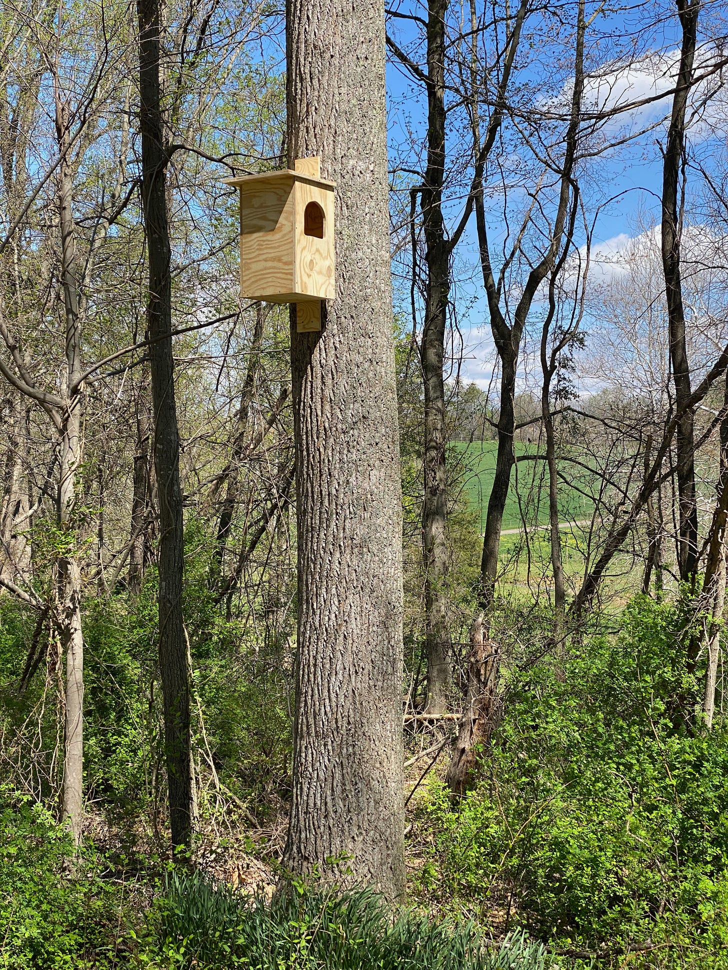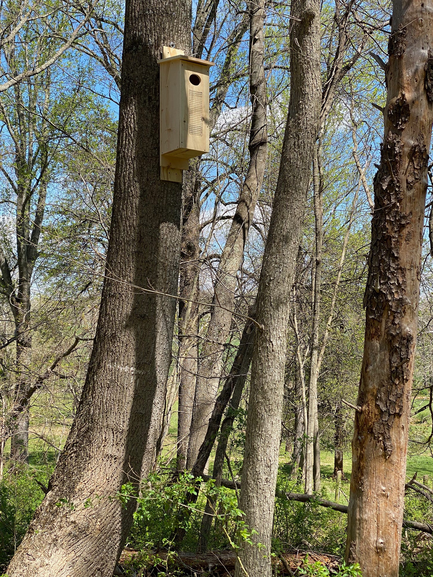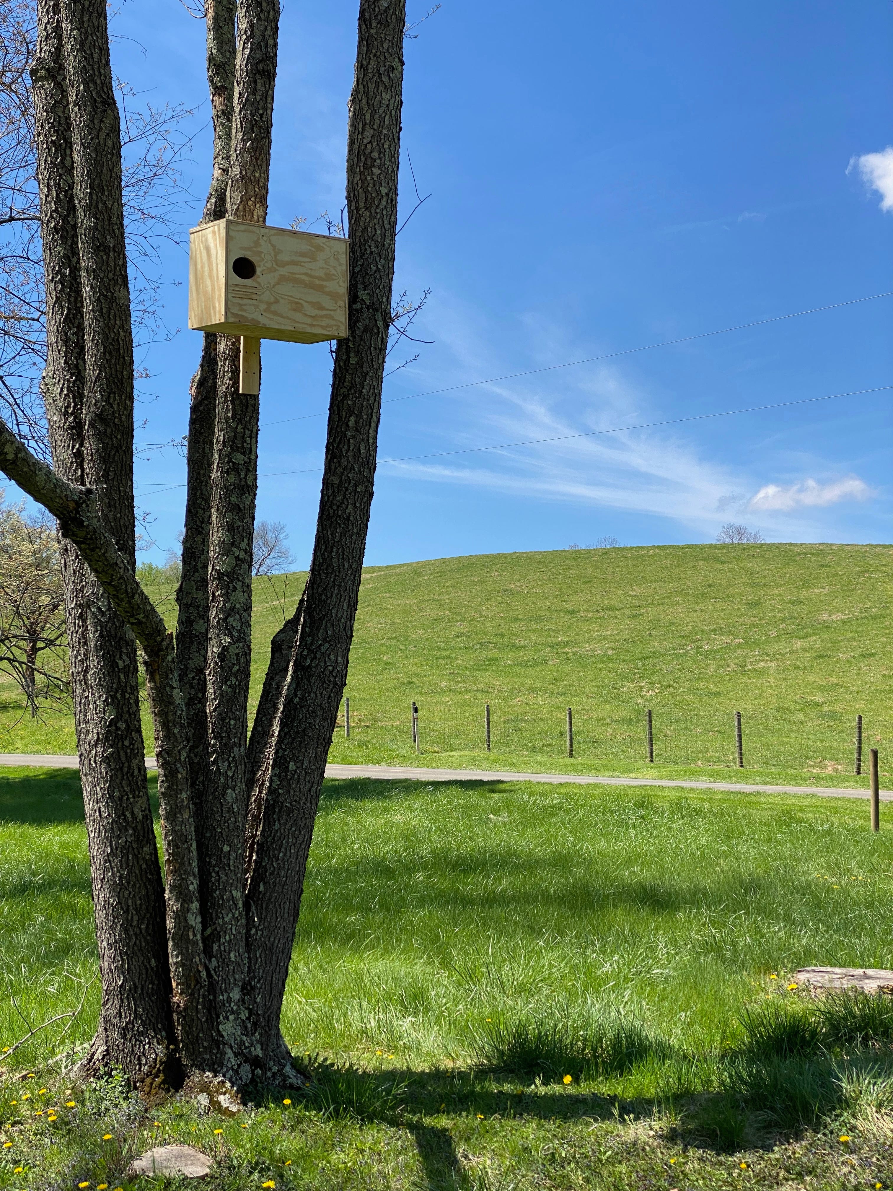 The rest of the boxes I needed to mount at least 12 feet high on various trees around the property. These boxes were big and heavy — the pileated woodpecker box is itself about three feet long and 40 pounds. I grabbed a ladder, leaned it up against a tree and clambered up. Holding the box in one hand and the ladder in the other, I used my nonexistent third hand to grab my cordless driver. M also nonexistent fourth hand helped hold things in place while I stored screws in my mouth and levitated in place.