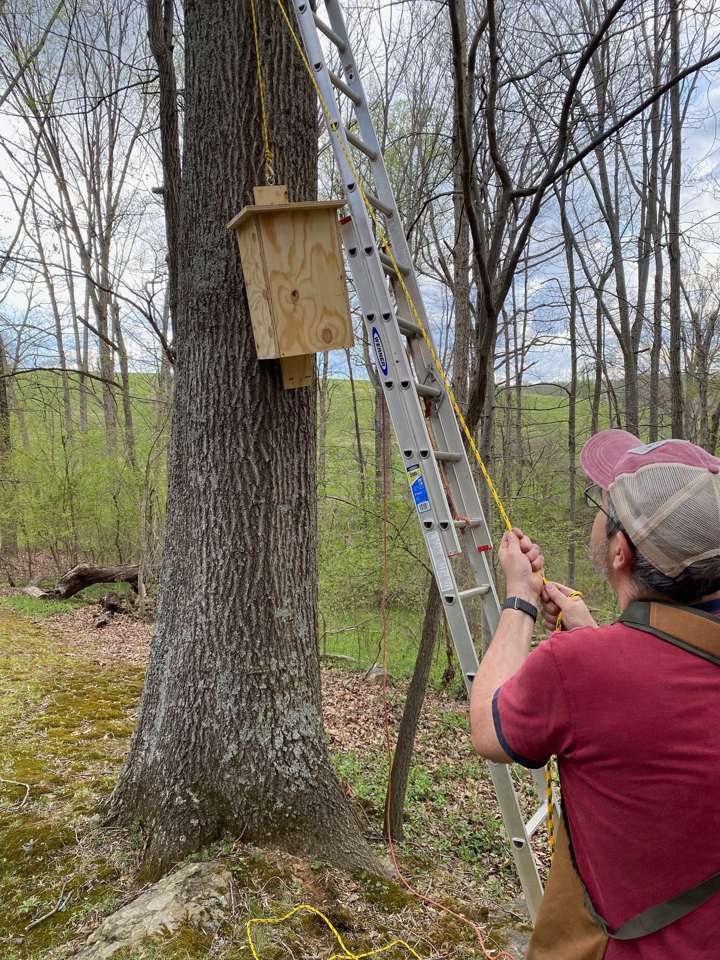 First, I would screw an eye hook into the top of each box. Then I'd climb a ladder to screw another eye hook into the tree above where I wanted the bird box to hang. Through that eye I'd thread a rope that I'd hook to the box. I'd hoist the box into place, have my wife hold the line, and then screw the box into the tree. Then we'd unthread the rope and move on.
