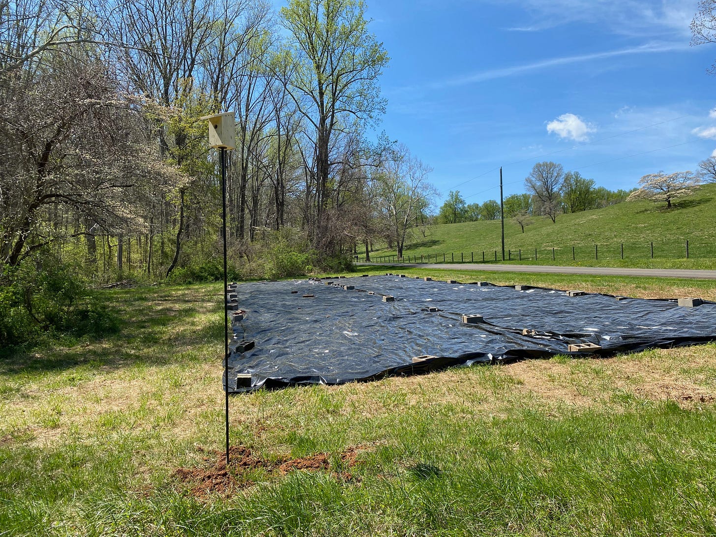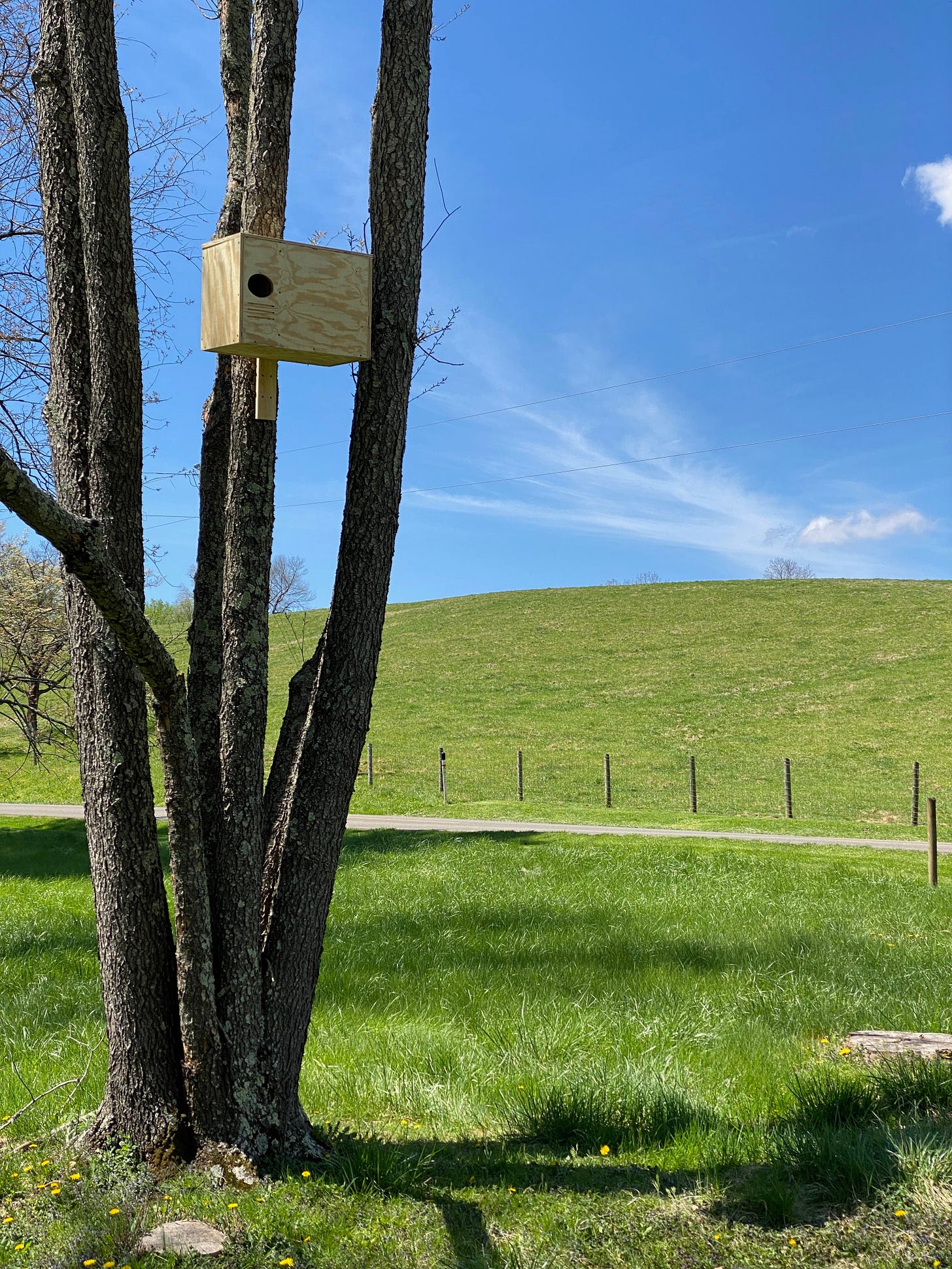The bluebird boxes, on the other hand, do not go on trees. They are best mounted on poles in grassy fields. To do that, I took a 10-foot-long ½-inch-diameter steel pipe with threads on the ends, screwed one end into a block of pressure-treated wood, and the other into a flange I mounted on the bottom of the bluebird box. Then I dug a two-foot hole, set the pole in place, poured in a bucket of water and a bag of quick-setting concrete. After holding the pole (and checking for plumb) for about 10 minutes, I let it go and it remained upright while the concrete set. Once the concrete was dry, I backfilled the hole.