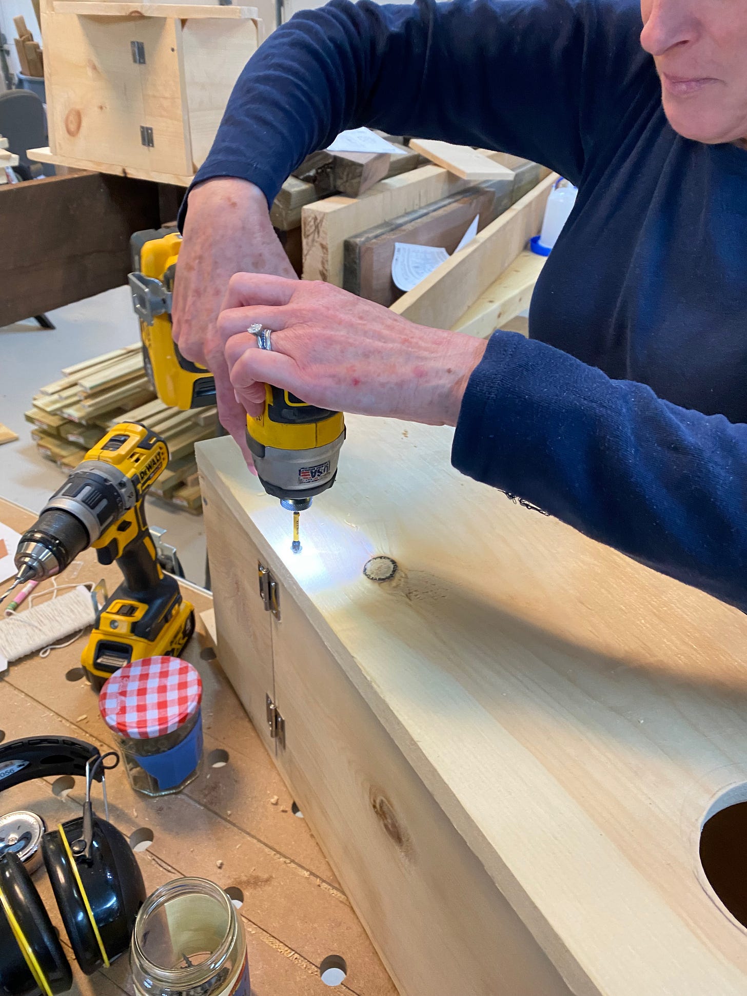 I headed to Home Depot to pick up supplies and back in the shop, started cutting wood to size. I ended up with enough material to make two bluebird boxes, three chickadee boxes, two barn owl boxes, two barred owl boxes, and one each for a hooded merganser, a pileated woodpecker and a kestrel.