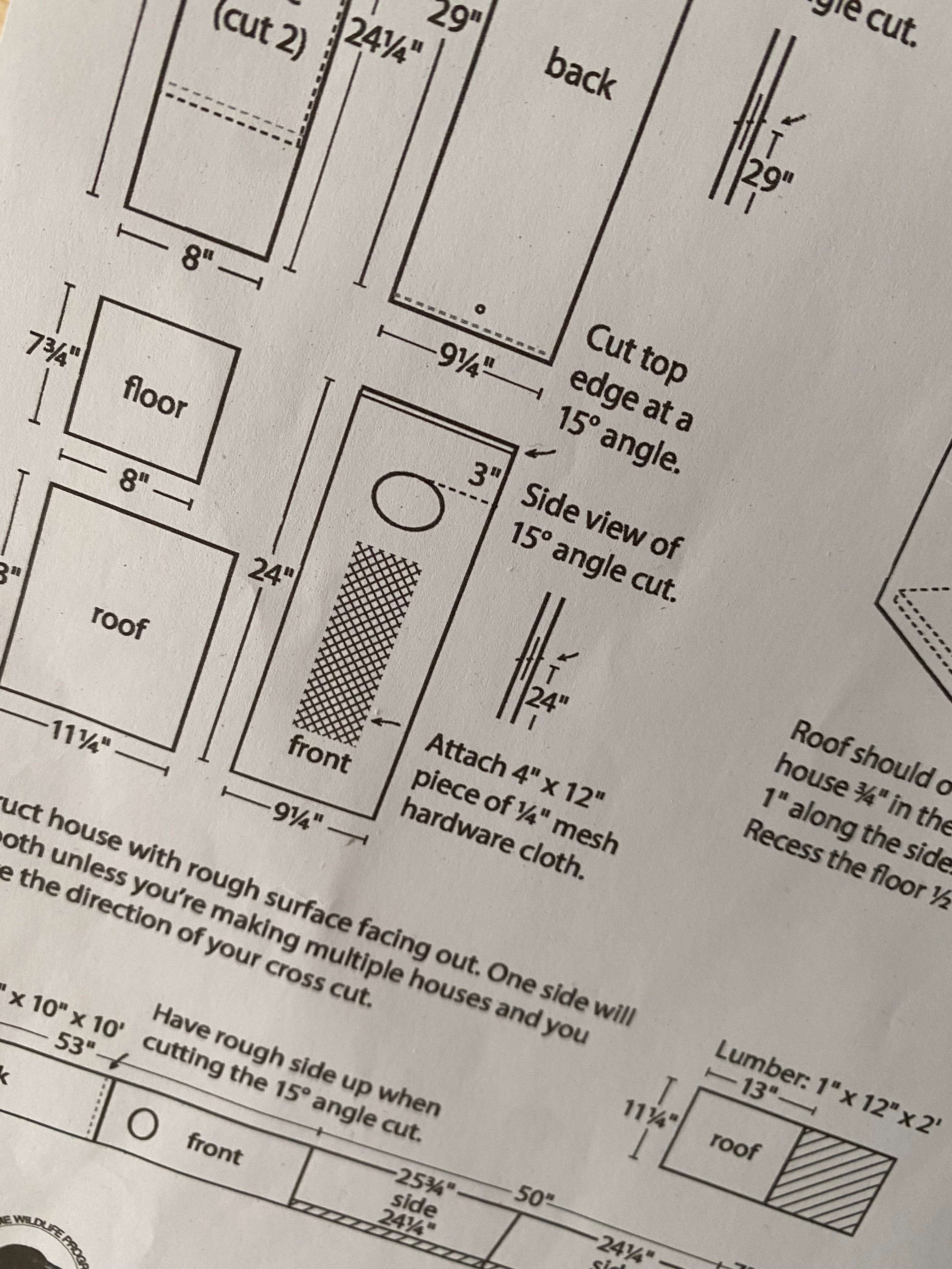 To start, I downloaded plans from the Cornell Lab of Ornithology's NestWatch site. They have dozens of plans with clear instructions. To be clear, the benefit of the plans is less "how do I build a bird house" and more "how do I build a bird house specific to a given species." That's because birds have certain needs, like hole size and shape. Ultimately, I chose seven plans based on the birds in our area and what my wife is interested in attracting: