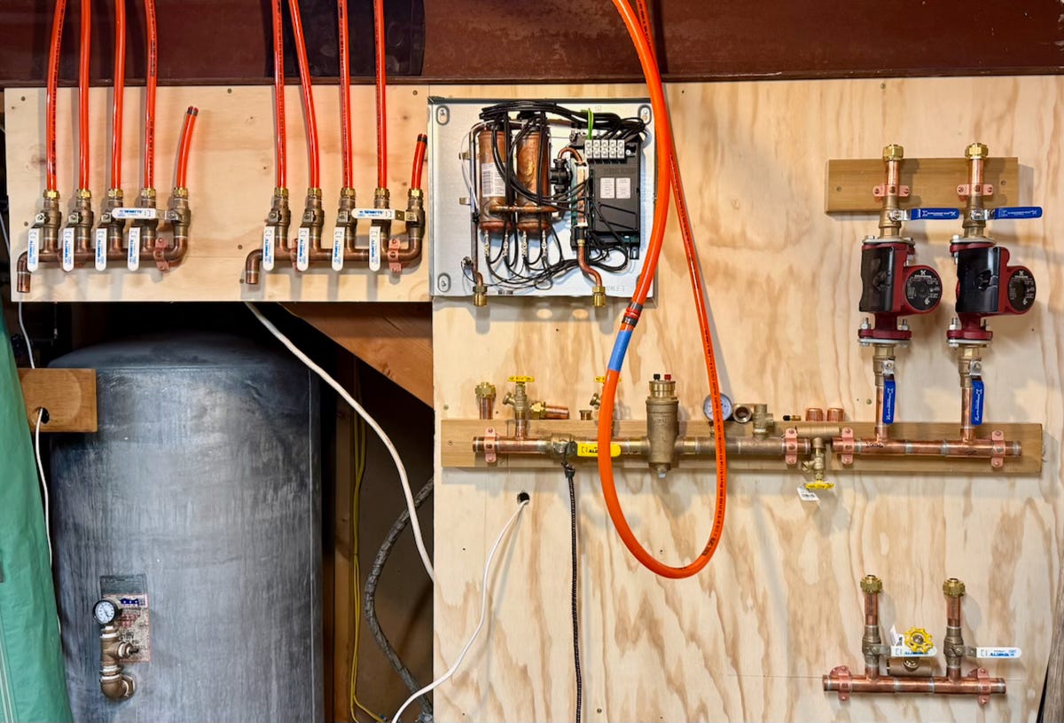 The mechanicals basically consist of some manifolds to distribute the water, a couple of pumps, an expansion tank, and an electric hot water boiler.